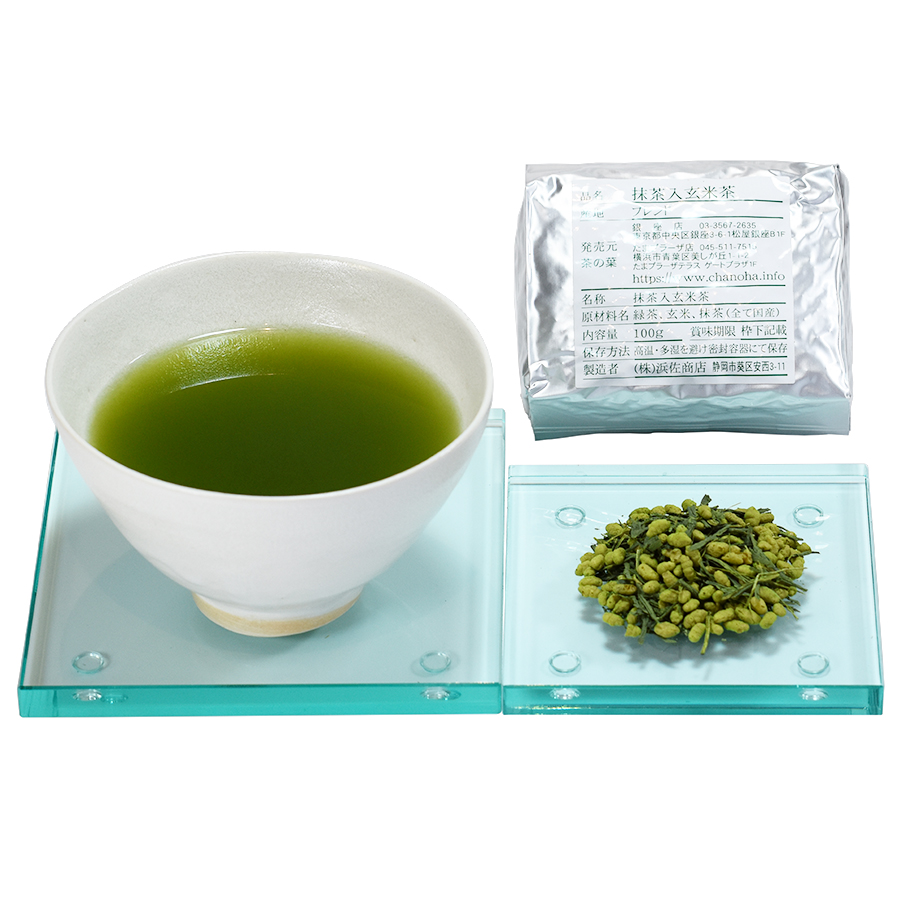 深蒸し煎茶(栽培期間中農薬不使用)に農薬・化学肥料不使用の焙煎玄米と抹茶をあわせました。